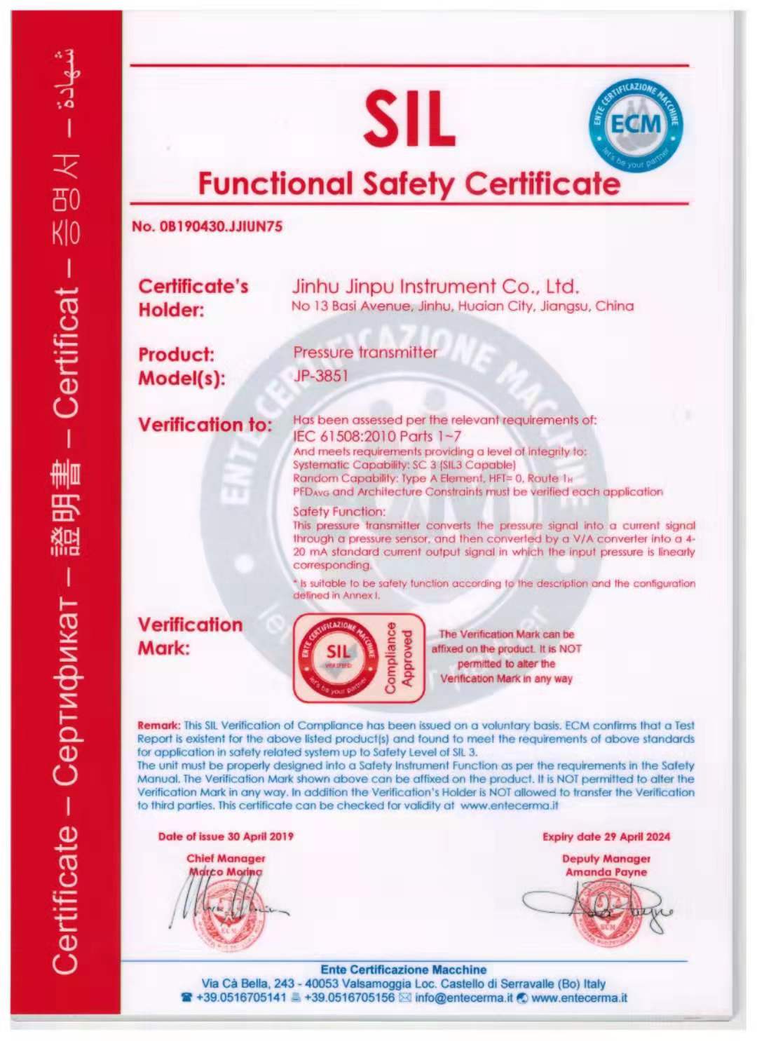 金湖金普儀表獲得SIL2認(rèn)證
