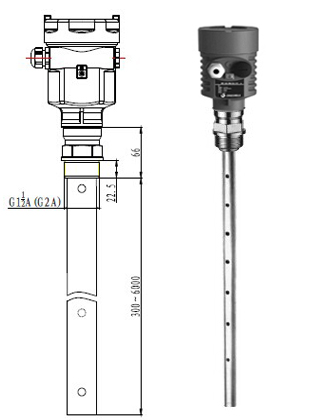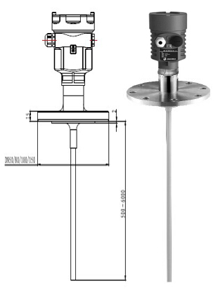 導波雷達物位計發出的高頻微波脈沖沿著探測組件(鋼纜或鋼棒)傳播,遇到被測介質,由于介電常數突變,引起反射,一部分脈沖能量被反射回來。發射脈沖與反射脈沖的時間間隔與被測介質的距離成正比。從而計算出探測組件頂部被測介質表面的距離,被測容器總高度是已知數,進一步可得出介質的物位高度。