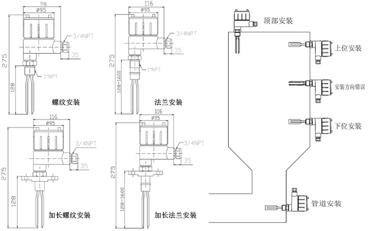 二、音叉物位開關外形尺寸圖及安裝示意圖: