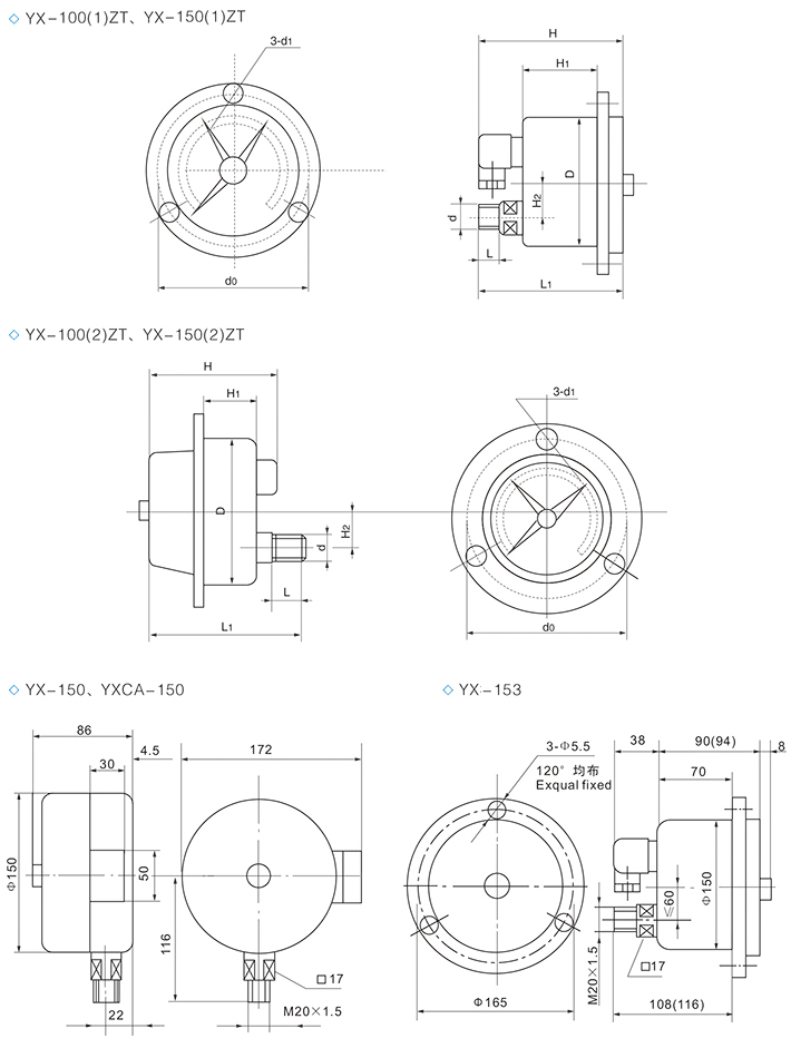 | YX-150 | Φ150 | 78 | 40 | 17 | 165 | M20*1.5 | 5.5 | 113 | 150 | 20 | |